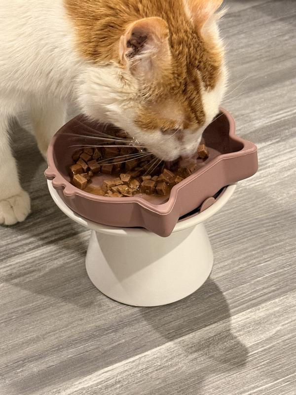 Muffins was very comfortable eating out of this bowl, he does not have a hard time any longer getting his food from the bowl.. I love how it suctions to the ceramic bowl allowing it to stay in place without detaching as well as the silicone is soft for when he needs to use his teeth to bite his food. This bowl is a 10/10!