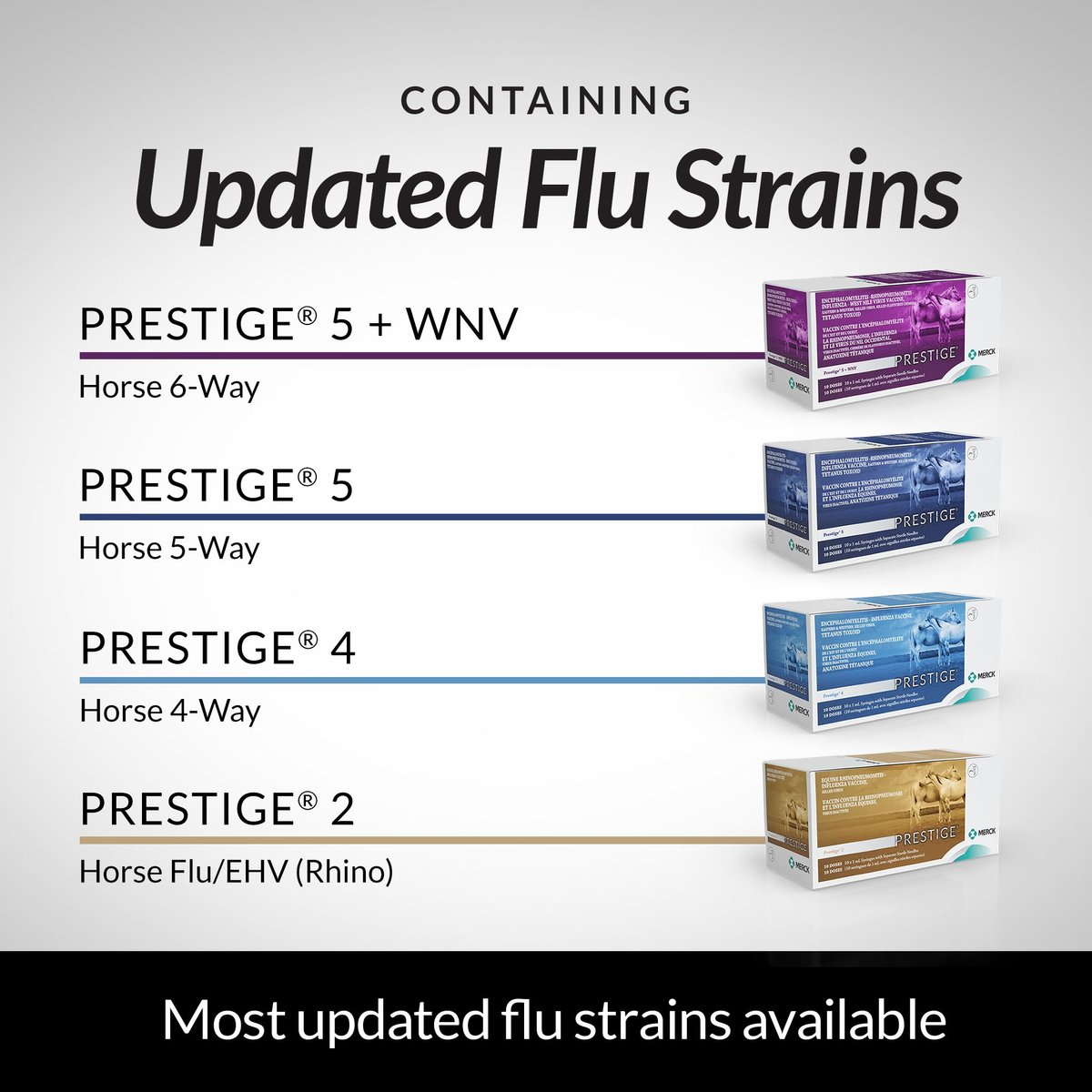 PRESTIGE 5 + WNV has been shown to be effective for the vaccination of healthy horses 6 months of age or older against Eastern and Western encephalomyelitis viruses (EEE/WEE), equine influenza virus (EIV), equine herpesvirus types 1 and 4 (EHV-1 and EHV-4), Tetanus and West Nile Virus (WNV).