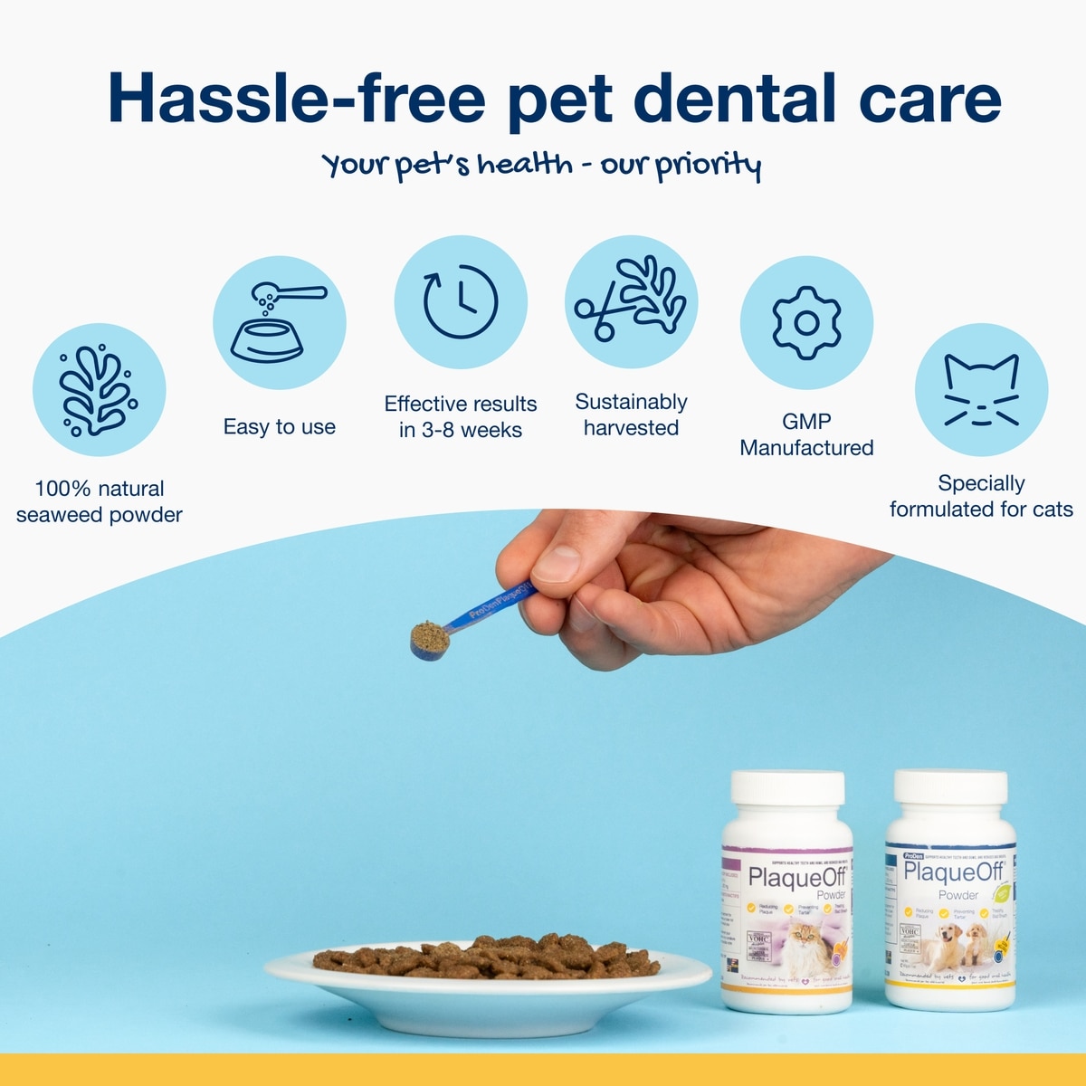 ProDen PlaqueOff helps reduce plaque and tartar and remedies bad breath. VOHC-approved and vet-recommended, it’s a simple, stress-free way to support your pet’s oral health—trusted by pet parents worldwide.