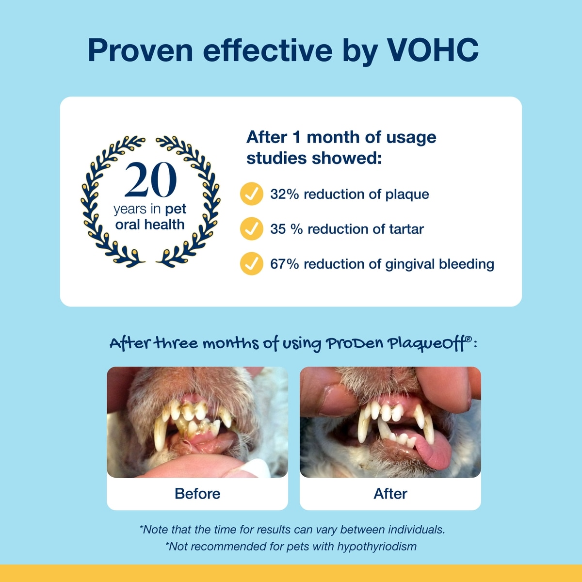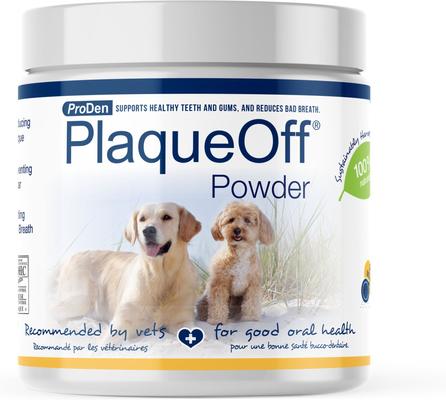 70% of pets will suffer dental health issues by three years of age, with the risk of dental problems increasing as they get older. Daily dental care with ProDen PlaqueOff helps reduce and control tartar and plaque, and it helps prevent bad breath, too.