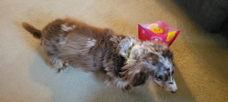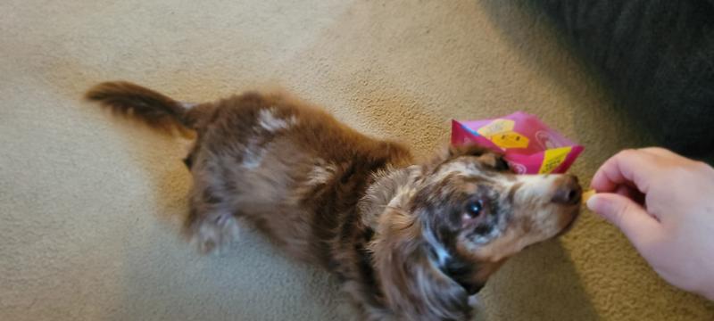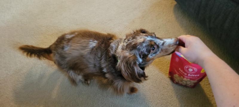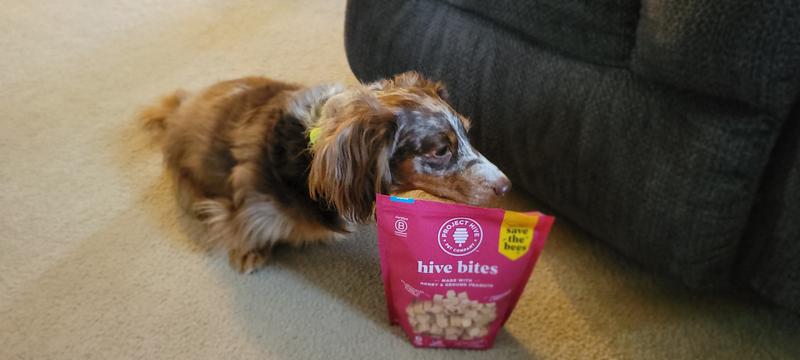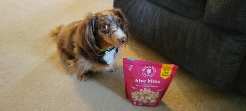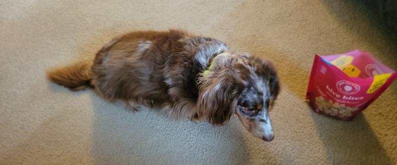Spencer was interested in trying the Hive Bites. We gave him 3 to start with and he wanted more! He has eaten them as a treat after coming in from outside after his morning walk.