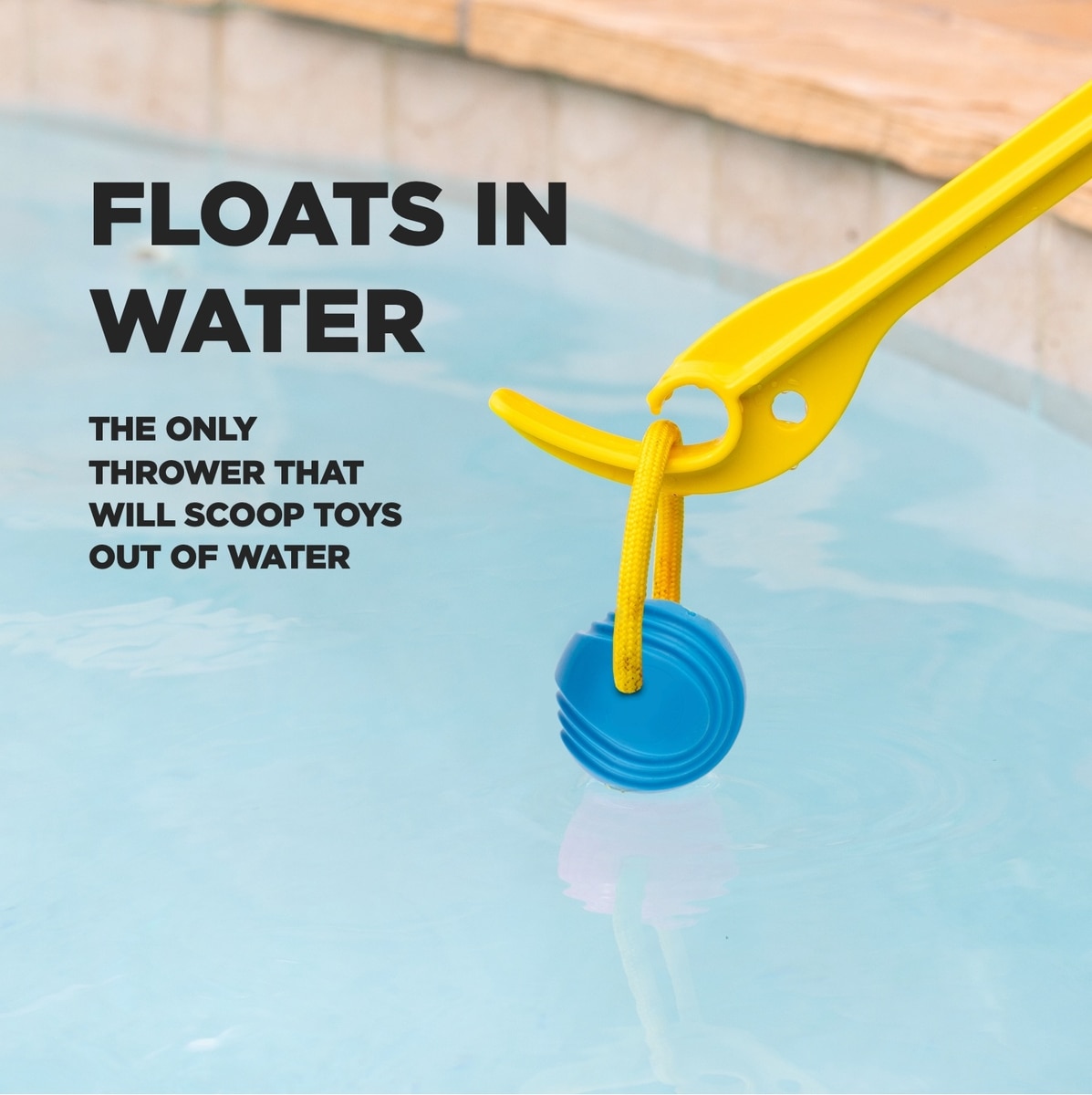The special hook design allows simple, hands-free, 360° retrieval on any surface—including in water, because all Looped Toys float. The handy hook at the other end keeps the thrower and toys together for easy carrying and storage.
