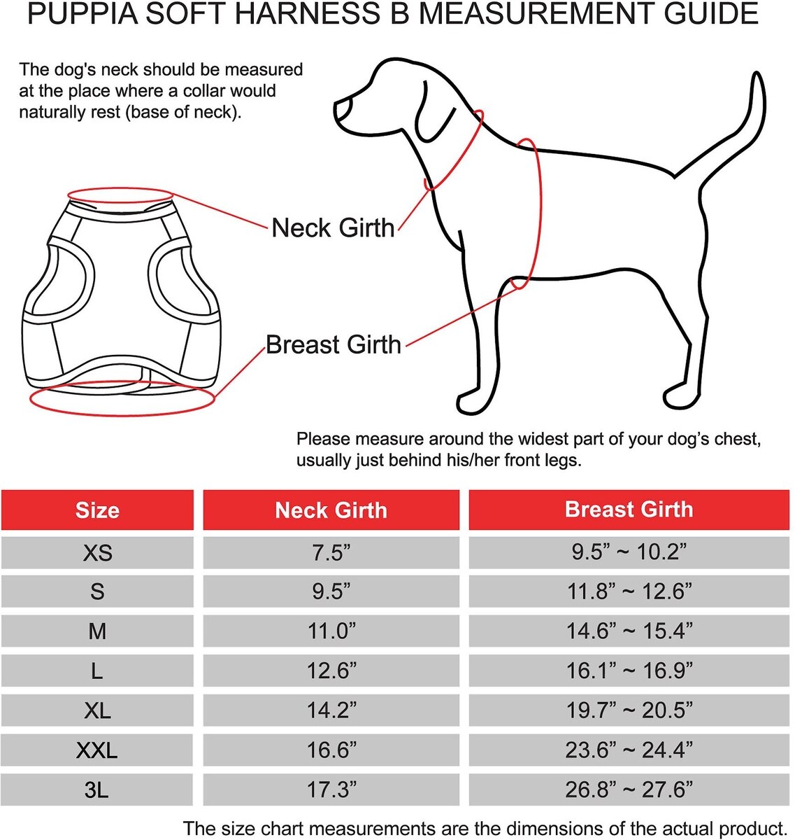 To get the most accurate size harness for your furry best friend, measure the girth of their chest, just behind the front legs, with a cloth tape measure. Pull the tape snug, but not tight. If you don't have a tape measure, you can also use a piece of string and measure it with a rigid ruler afterwards. Make sure there’s enough room for about two fingers between the harness and your pup’s chest.
