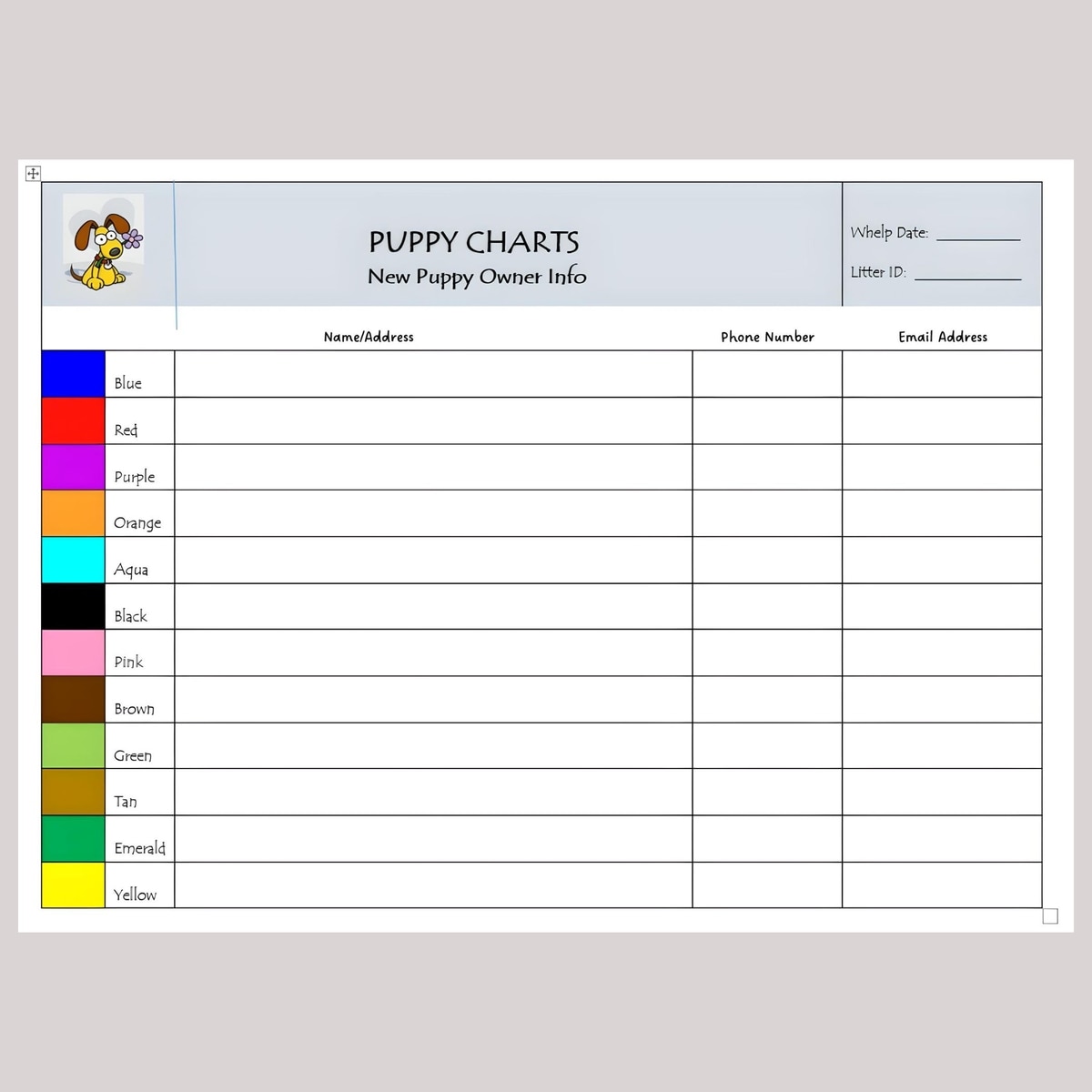 I like the fact that the colors coordinate with the identification bands, but it would be more helpful to have columns for weights at different ages. ie birth, 3 weeks, 6 weeks, 9 weeks, 12 weeks rather than position/placenta & minutes between birth.