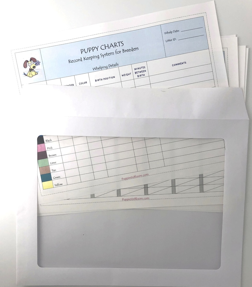 The Puppies In Bloom 'Record Keeping Charts' are printed on 32 weighted paper (thicker than average paper). The size is 8-1/2 x 11 size and comes in a large envelope with a window. The charts can easily be placed in a binder.