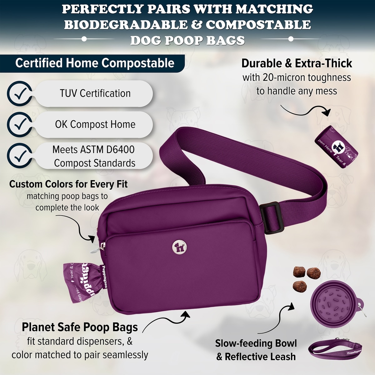 - Each bag comes with durable poop bags that are eco-friendly and color-matched to the bag.