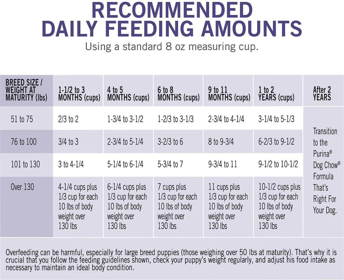 | 51 - 75 lbs | 2/3 - 2 | 1 3/4 - 3 1/2 | 1 2/3 - 3 1/3 | 2 3/4 - 4 1/4 | 3 1/4 - 5 1/3 | Transition to the Purina Dog Chow formula that's right for your dog. |