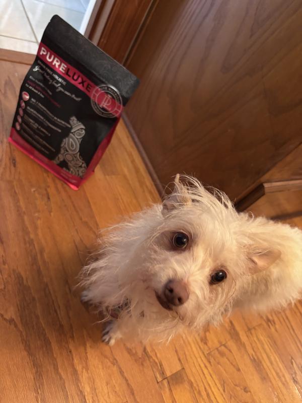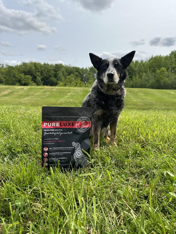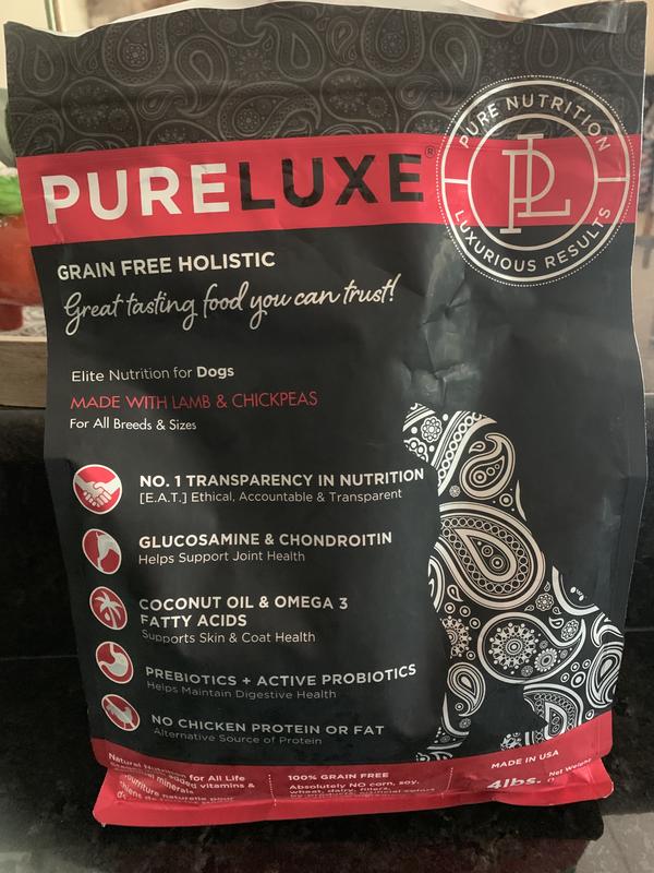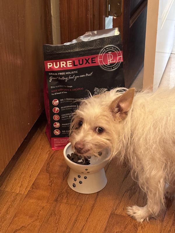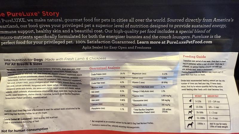 PureLuxe Elite Nutrition Grain-Free Lamb and Chickpea Dry Dog Food has a very eye catching package. Kit is a 14 lb. terrier/chihuahua mix who is who is somewhat