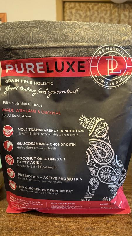 I am using Pureluxe Nutrition Grain-Free Lamb and Chickpeas dry dog food as a topper for my dog Larry’s food. Larry has a chicken sensitivity so this is a perfect addition and he seems to be enjoying it. The closure on the bag works great so freshness should be preserved!