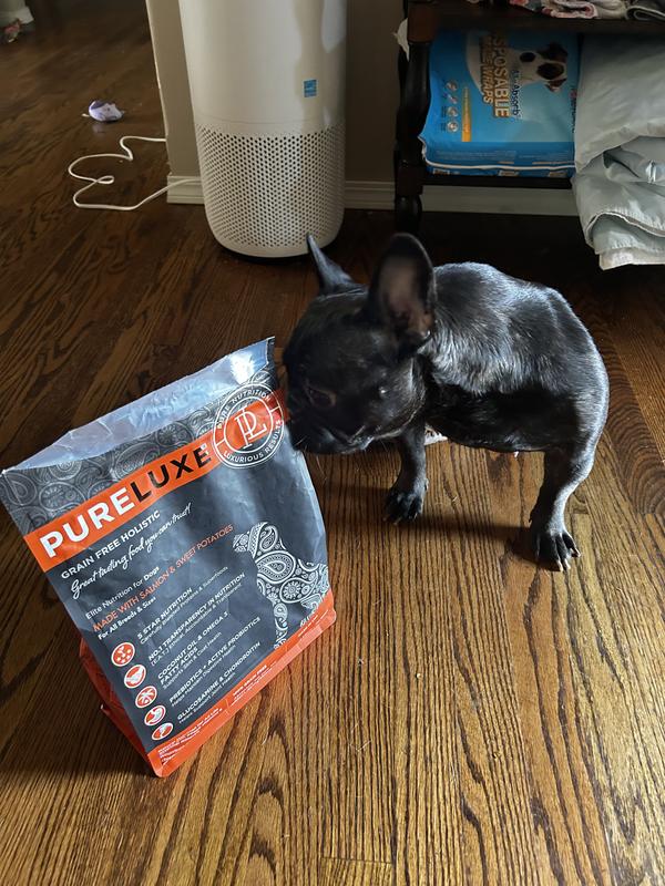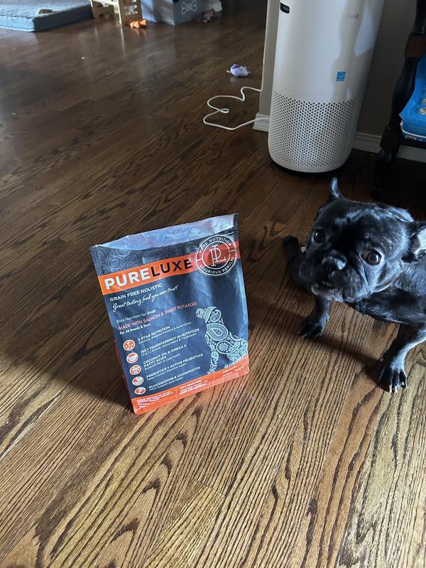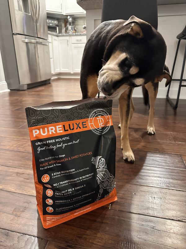 Pure luxe dog food made with salmon and sweet potatoes has many great qualities. It is made in the USA , has salmon listed as the first ingredient, and is good for all breeds and sizes. I have a 13 year old German shepherd who is very picky and she liked this food. I was pleasantly surprised to find that there is a seal on the bag that actually works and keeps it closed. It is plastic Velcro and so easy to use. Finally someone has come up with workable closure. I would definitely recommend this product