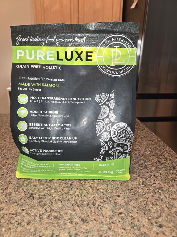 - Pureluxe offers online transparency reports for pet parents to learn more about the food they’re feeding their cat.