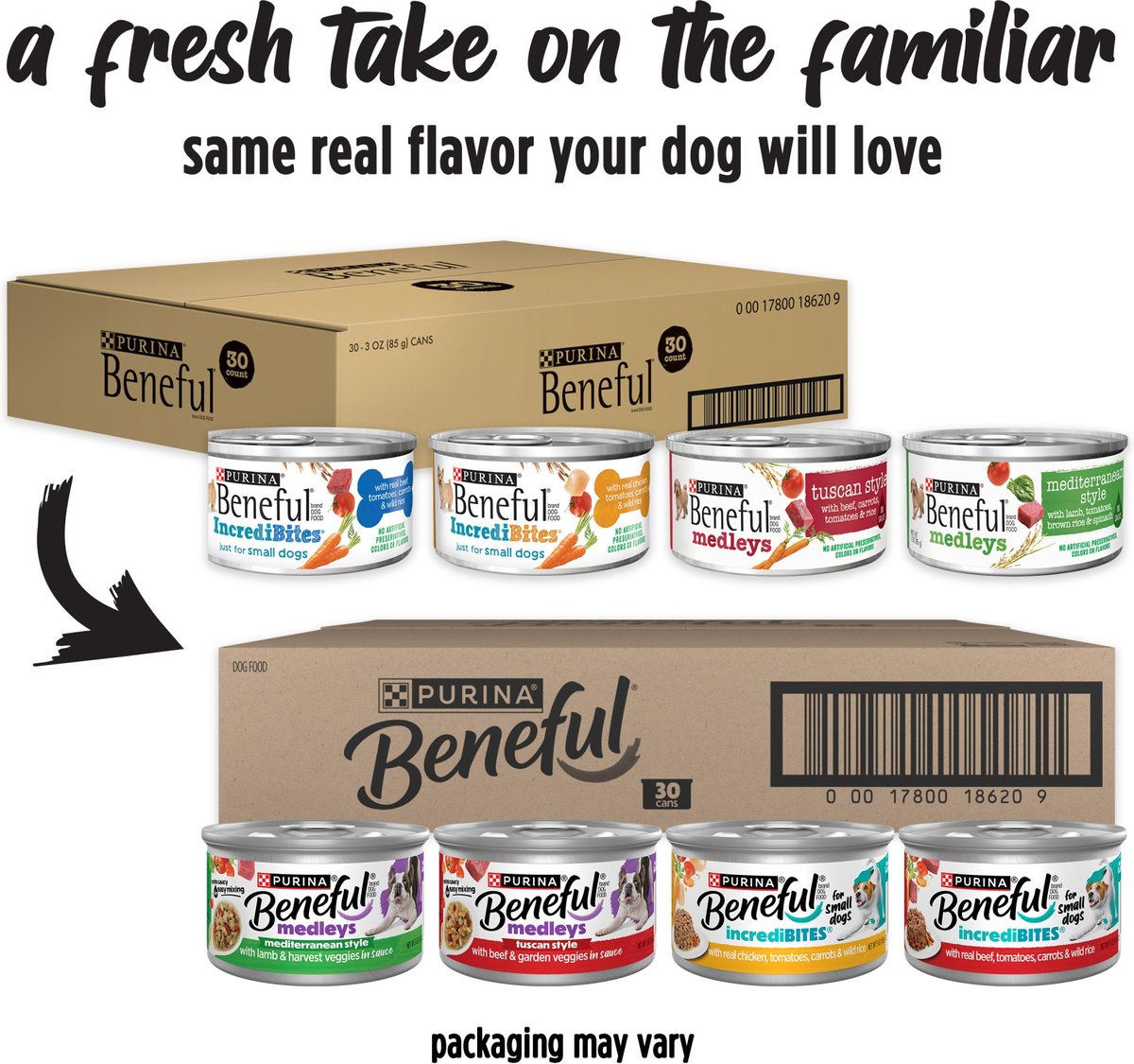 - Purina Beneful IncrediBites Adult Variety Pack Chicken Beef & Salmon Small Breed Wet Dog Food, 3-oz can, case of 30$25.28 Chewy Price$29.96 List Price$24.02 Autoship PricePromo, New Customers Only: Spend $49+, Get $20 eGift Card