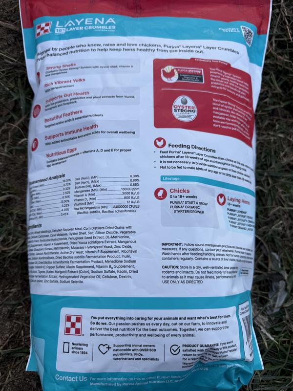- Purina Animal Nutrition Purina Layena Pearls 16% Protein Chicken Feed, 25-lb bag$18.99 Chewy Price$18.04 Autoship Price
