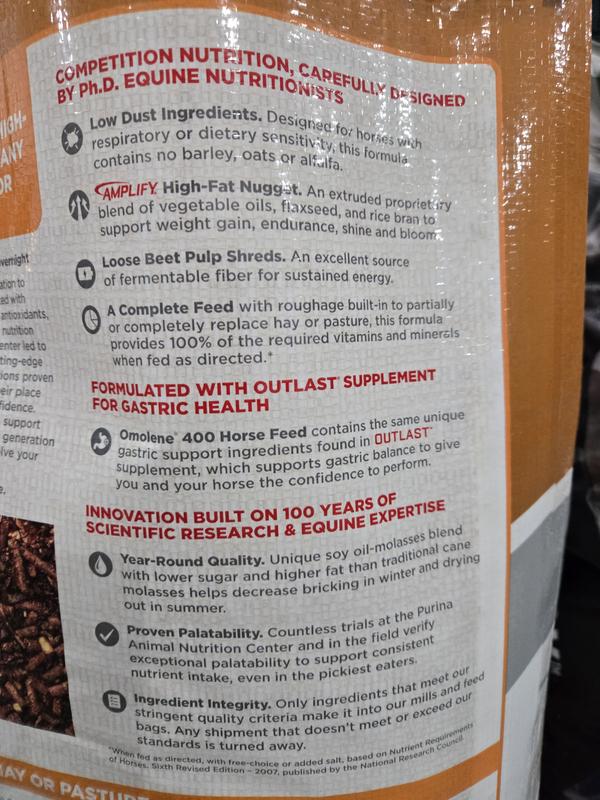 - Purina Animal Nutrition Purina Omolene 500 Competition Horse Feed, 50-lb bag$26.99 Chewy Price$29.99 List Price$25.64 Autoship Price