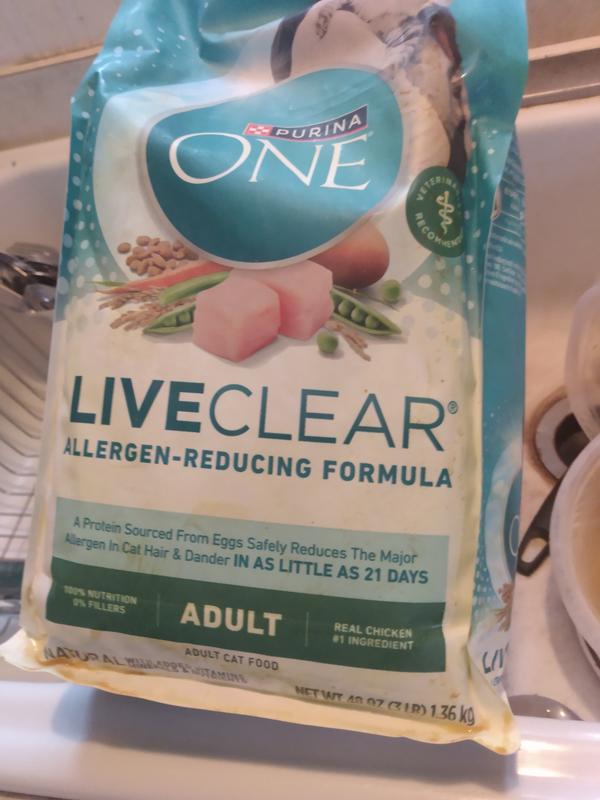 From day 1, the real chicken, quality carbohydrates, and easy digestibility of Purina ONE LiveClear bring great taste, nutrition, and healthy energy with every meal. By day 21, LiveClear starts to reduce the major allergen in cat hair and dander.