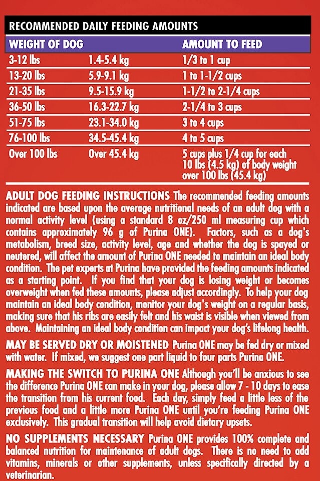 Purina ONE is high-quality natural nutrition with added vitamins, minerals, and nutrients made to support your dog’s health, inside and out. Feed Purina ONE and see the visible difference in your dog—today, and for a lifetime.