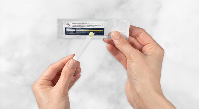 Using the At-Home Oral Health Test is easy. Begin by removing the test strip from the foil pack. Gently rub the padded side along your pet’s gums for about 5 seconds. Wait 10 seconds, then compare the pad’s color to the scoring scale on pack. This scale indicates the level of thiols in your pet’s mouth, and the pack provides guidance on the next steps based on the results. However, any amount of yellow indicates a positive test and a vet consultation is needed.