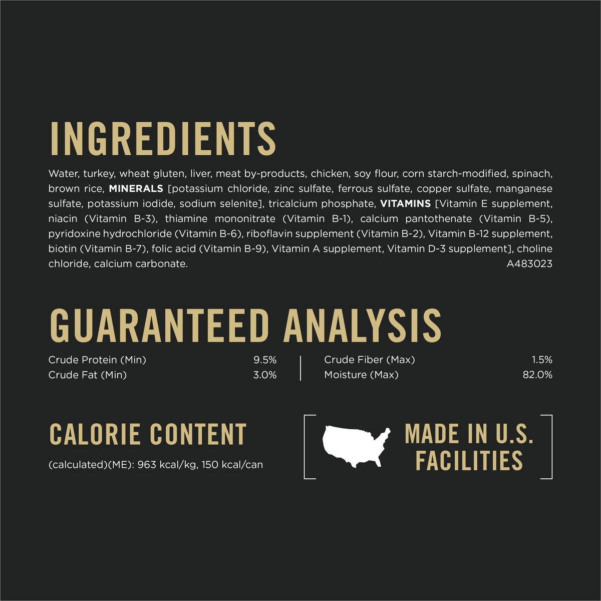 Water, Turkey, Wheat Gluten, Liver, Meat By-Products, Chicken, Soy Flour, Corn Starch-Modified, Spinach, Brown Rice, MINERALS [Potassium Chloride, Zinc Sulfate, Ferrous Sulfate, Copper Sulfate, Manganese Sulfate, Potassium Iodide, Sodium Selenite], Tricalcium Phosphate, VITAMINS [Vitamin E Supplement, Niacin (Vitamin B-3), Thiamine Mononitrate (Vitamin B-1), Calcium Pantothenate (Vitamin B-5), Pyridoxine Hydrochloride (Vitamin B-6), Riboflavin Supplement (Vitamin B-2), Vitamin B-12 Supplement, Biotin (Vitamin B-7), Folic Acid (Vitamin B-9), Vitamin A Supplement, Vitamin D-3 Supplement], Choline Chloride, Calcium Carbonate. A483023.