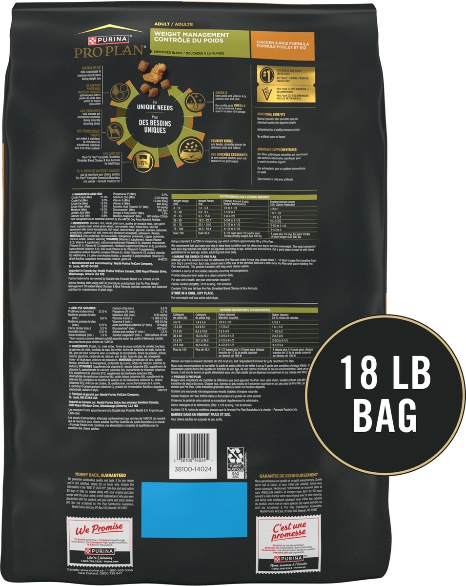 Purina Pro Plan Adult Weight Management Shredded Blend Chicken & Rice Formula Dry Dog Food, 18-lb bag