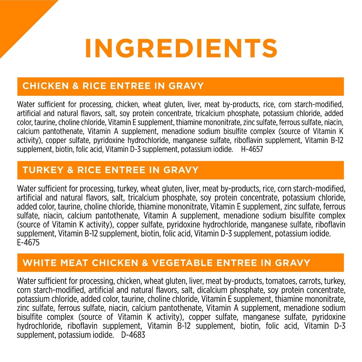 Chicken & Vegetable Entree: Water, Chicken, Wheat Gluten, Liver, Meat By-products, Tomatoes, Carrots, Turkey, Corn Starch-modified, Glycine, Salt, Soy Protein Concentrate, Natural Flavor, Tricalcium Phosphate, MINERALS [Potassium Chloride, Zinc Sulfate, Ferrous Sulfate, Manganese Sulfate, Copper Sulfate, Potassium Iodide], Taurine, Choline Chloride, VITAMINS [Vitamin E Supplement, Thiamine Mononitrate, Niacin, Calcium Pantothenate, Vitamin A Supplement, Menadione Sodium Bisulfite Complex, Pyridoxine Hydrochloride, Riboflavin Supplement, Vitamin B-12 Supplement, Biotin, Folic Acid, Vitamin D-3 Supplement]. F468322