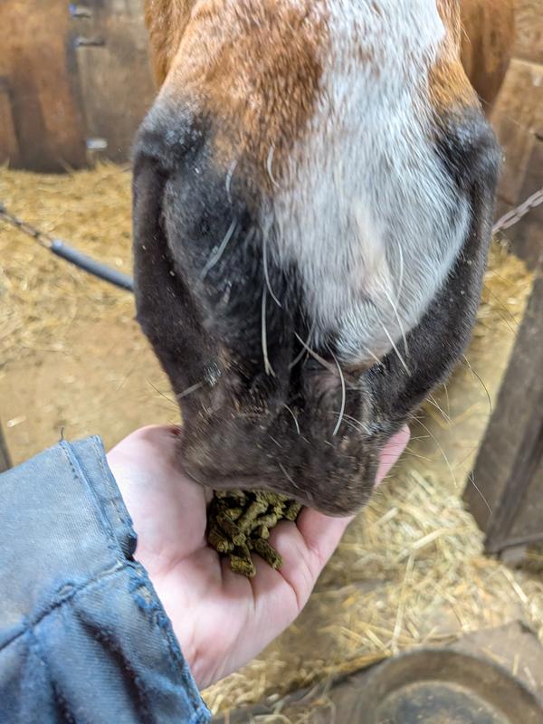 I have a mini horse w Cushing's so am very particular about what I feed him. Squirt is on Day 5 of this feed being mixed in with his routine pelleted feed. He noticed