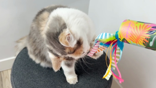This toy is cute but requires human and cat interaction to make it work. The toy is similar to a party popper if you will, and you shoot out the confetti, only in this case its strings and feathers. It’s a bit short so not like a string chaser toy and requires you to be close to the cat to interact. My cats don’t like the sound it makes and would much rather just play with the stings, but you have to hold it and play, which is fine, but this isn’t something that would be in the toy box for everyday use or play on their own, it requires a human to “activate” and cats lost interest within a few minutes. It’s a cute toy and the thought behind it was cool, but I don’t recommend it and would pass for something the cats could enjoy 24/7 without supervision.