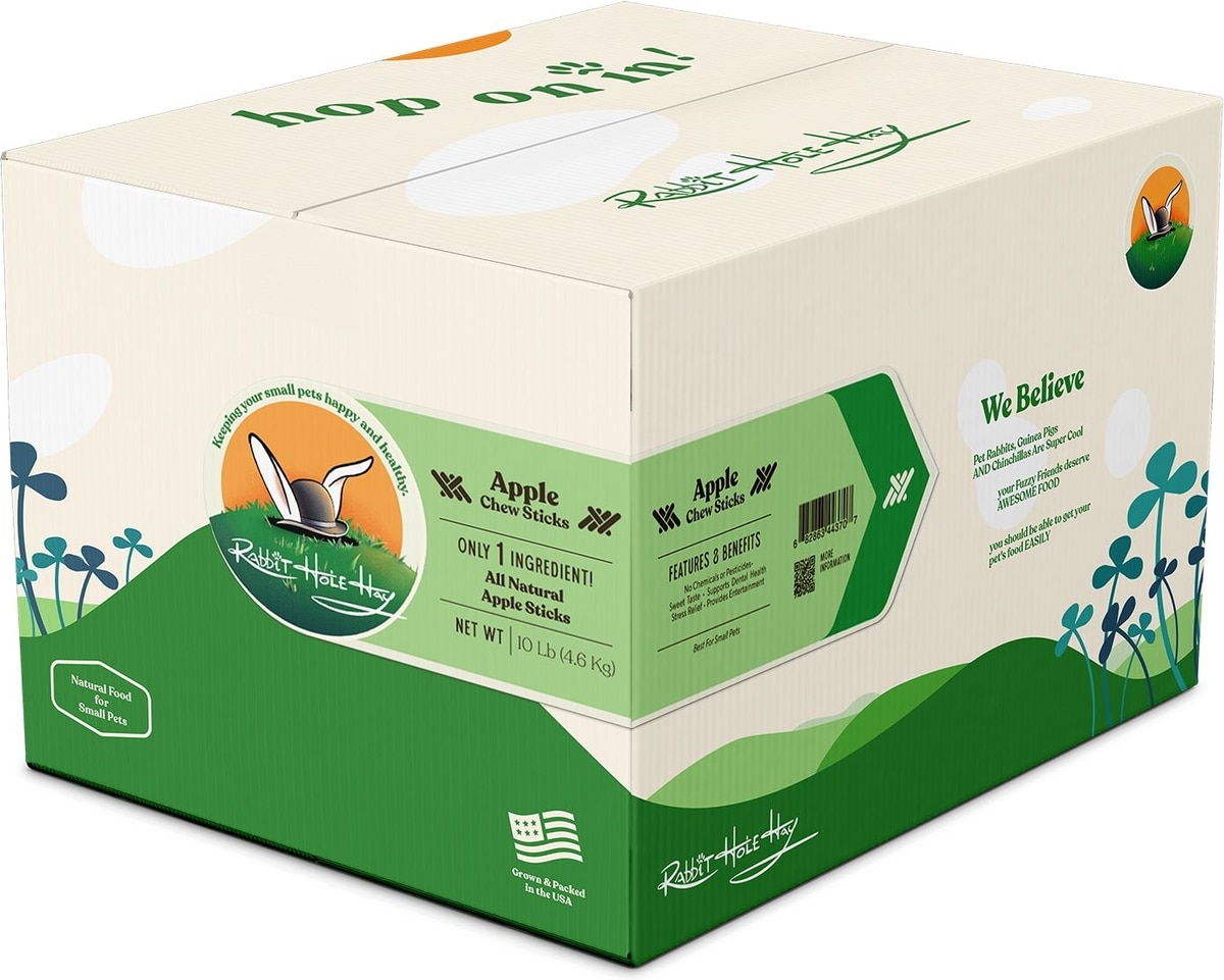Rabbit Hole Hay All Natural Apple Chew Sticks are chosen from suppliers who harvest 100% real apple sticks from Fuji Apple trees. Rabbit Hole Hay buys and sources from growers in Northern California, Northern Nevada and Southern Oregon.