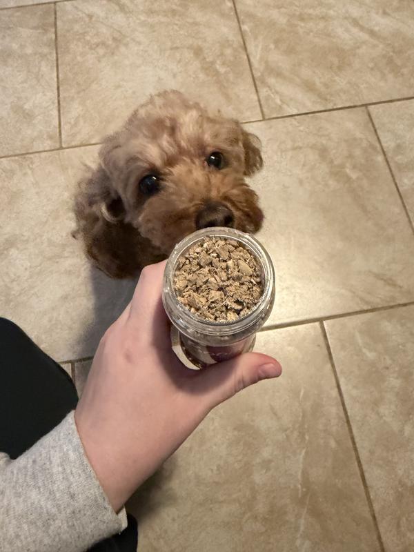 My 18-year-old Maltese has been going through some tough times lately. Her appetite has been low and she has kidney & liver disease. Trying to find something that she would eat has been quite a challenge. We saw this flavor booster and thought it would be neat to try out to see if it can entice her. We only needed to sprinkle a very small amount on top of her food and she went crazy for it. She had a decent meal after a very long time of struggling to eat. The smell is very strong for the freeze dried beef liver and the ingredient is only beef liver, no other additives. I feel comfortable giving her this knowing that I'm not giving her other additives and preservatives with it that could worsen her condition. Everyday after the intial try is hit or miss but it does help her and there to help her eat.