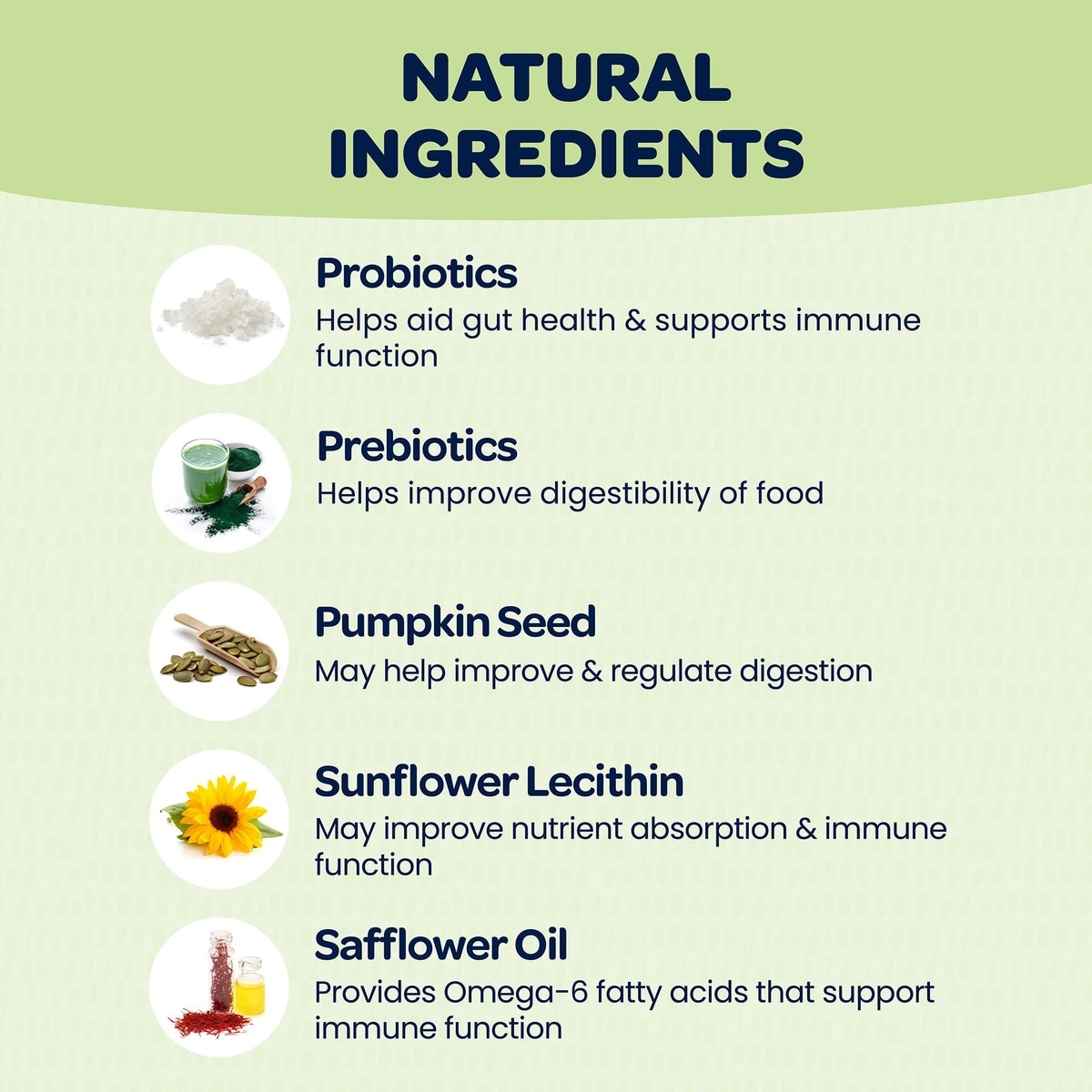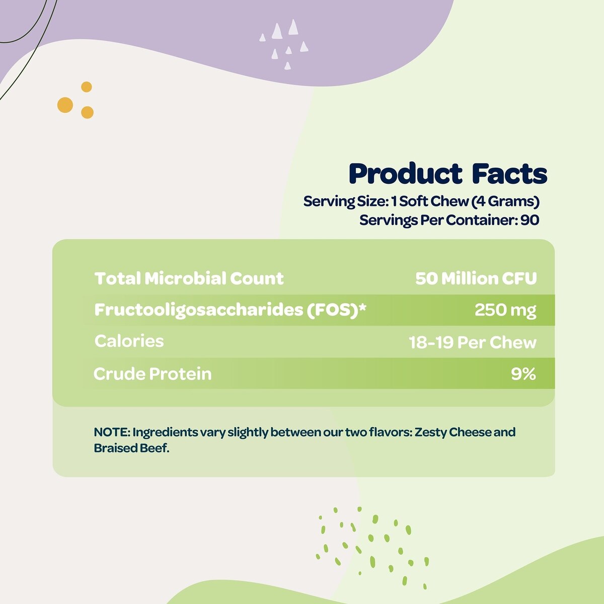 - Chews contain a soothing blend of probiotics, prebiotics, and pumpkin seed powder.
