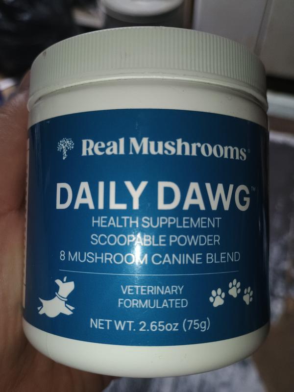 Daily Dawg is a real mushroom health supplement for dogs. There are 8 mushrooms for a delicious canine blend. It is scoopable and easy to mix into the dog food