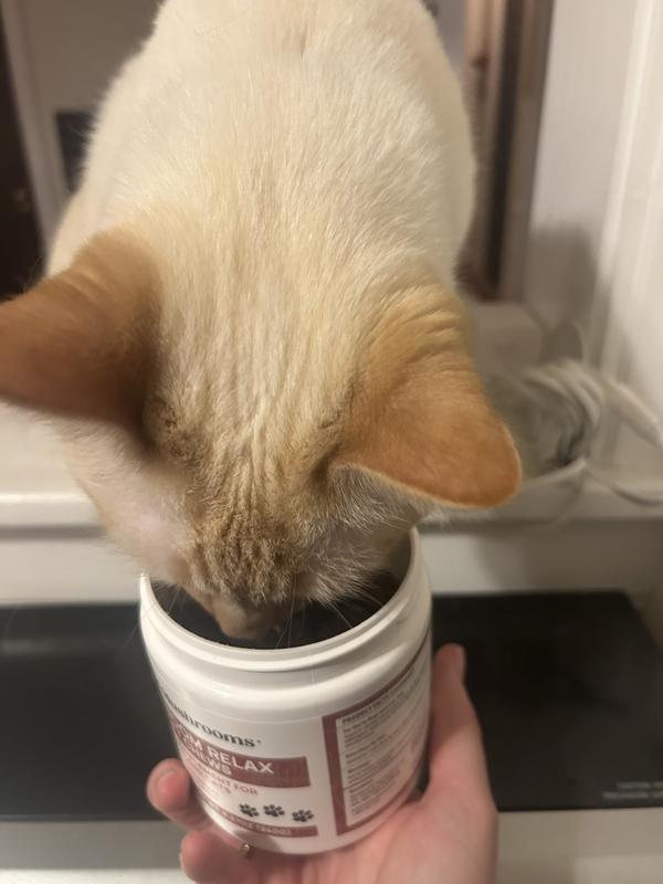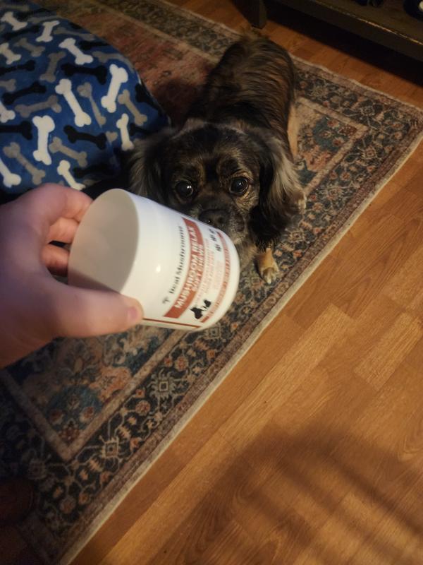 My MacKenzie is a very pickie treat taker. I have had to give treats I bought for her to other dogs in the family because she would not even try them. One sniff and “no not even going to try it” and off she goes. So was very concerned when the Real Mushrooms Mushroom Relax Soft Chewy came. If she would not try them I could not review. But what a surprise, she took it and did not even stop to smell it. This was just a try to see if she took it. There was no stress reason to give to her but she did appear very happy to not go out to chase something in the yard. She hates the car and needed to go to the vet so a perfect time to see how it affected her in her most stressed time. It worked very well, she barely panted at all. So the taste for particular dogs seems good and I saw it work with stress. So when this container is gone I will definitely get another to keep for car rides and thunderstorms/lightening they terrify her.