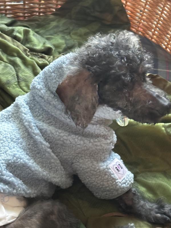 Awww I love this sweater and so does my little white dawg. It’s so soft, and we also love the lewk the sleeves give us. He’s a warm boy in this one :) I’m buying another in green He is 15lbs and medium was perfect