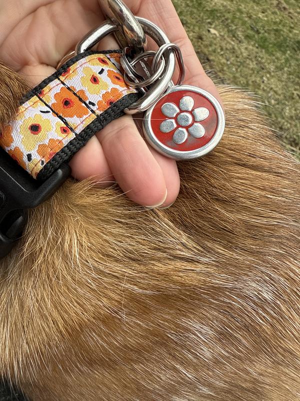 This tag is perfect for the spring and summer. It’s bright and cheerful, matched her color perfectly, and is well made. The metal is thick and durable, the etching clear, and the color is vibrant. I’m very pleased with this purchase.