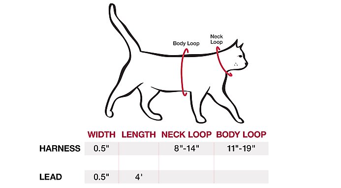 Red Dingo Cat Harness and Lead combo kits include a 4 ft. lead and an adjustable harness. To ensure a safe and comfortable fit, measure your cat’s body loop just behind the front legs (A), and your cat’s neck loop (B), then compare them to the size chart.