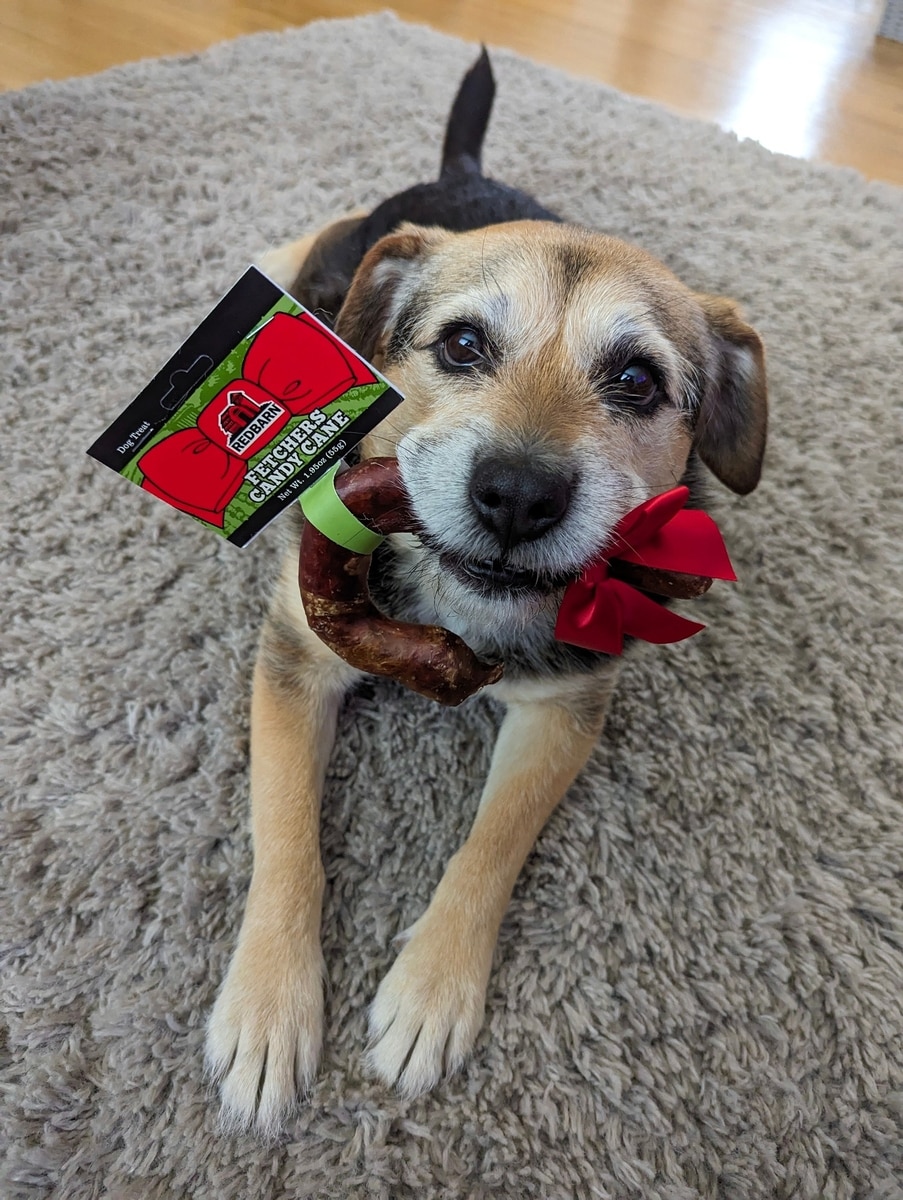 The bow is included in the Redbarn Holiday Fetchers Candy Cane Dog Treat.