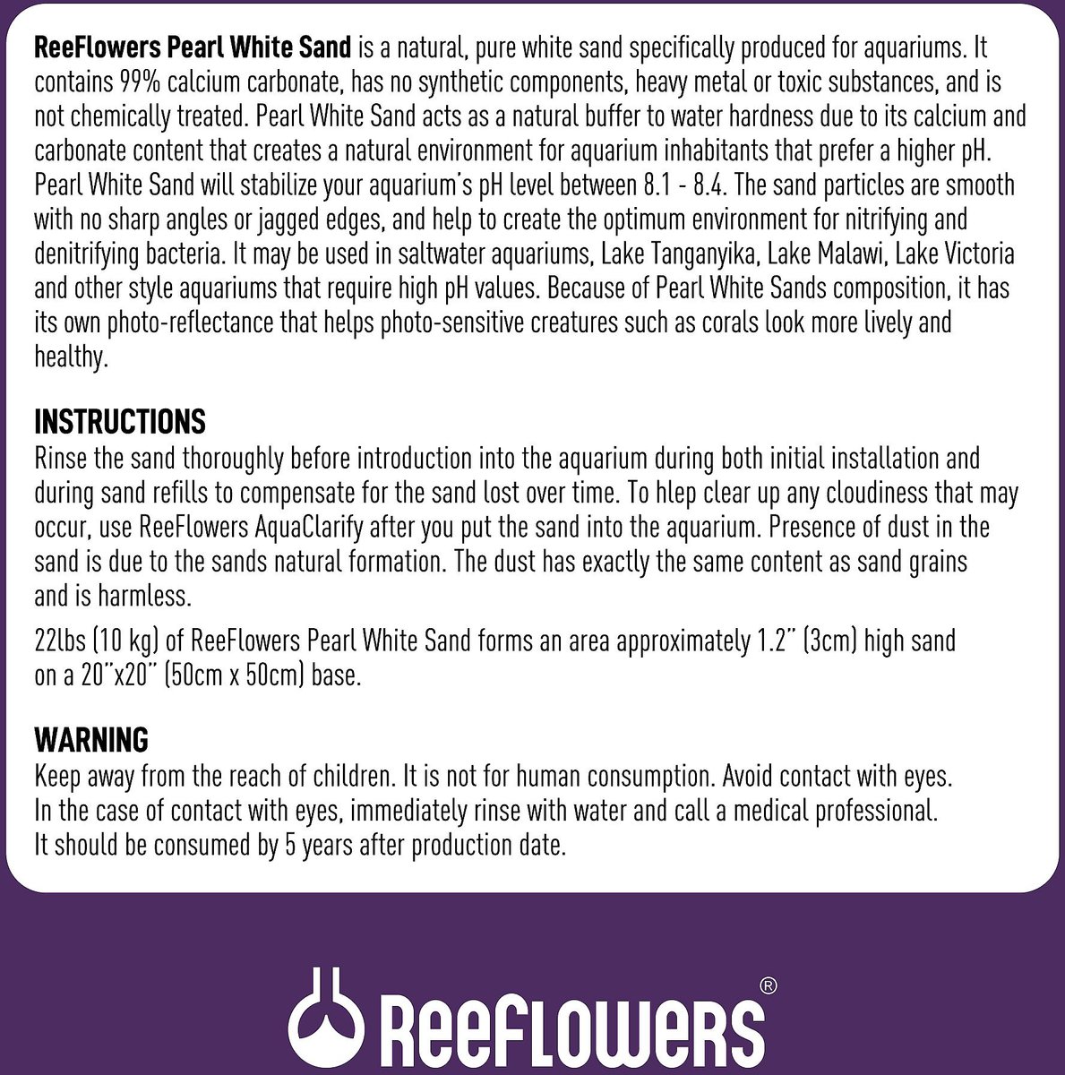 Rinse the sand be thoroughly before introduction into the aquarium during both initial installation and during sand refills to compensate for the sand lost over time. To help clear up any cloudiness that may occur, use ReeFlowers AquaClarify after you put the sand into the aquarium. Presence of dust in the sand is due to the sands natural formation. The dust has exactly the same content as sand grains and is harmless. 22 lbs (10 kg) of ReeFlowers Pearl White Sand forms an area approximately 1.2" (3 cm) high sand on a 20"x20" (50cm x 50cm) base. Particle Sizes: 0.5 - 1 mm, 1 - 1.5 mm