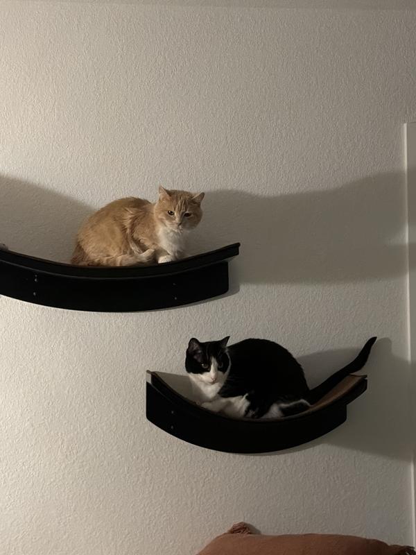 This cat shelf has a weight limit of up to 50 pounds when screwed into wall studs.