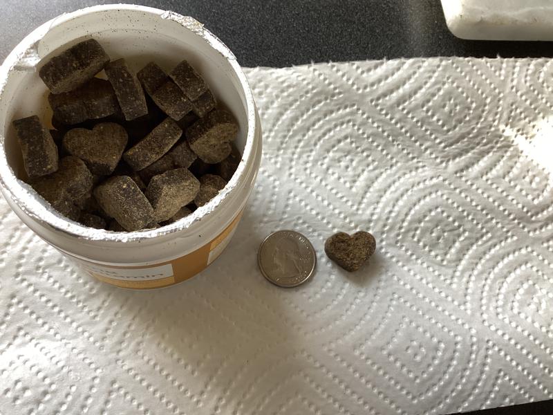 These vitamins are very easy to give your pet. They can actually be broken in half . They are not really hard. I've Posted a photo of one next to a quarter so you can see about the size they are. They smell sort of like liver. At first my dog thought it was a pill we were trying to sneak in on herand she didn't want to eat it .But after she tried it. It's been easy to give them to her, and she eats them up like treats. I can't say anything bad about them. I think they're a very good product easy to give your pet. The only problem I have is with the labeling of the jar being an older person is hard to read that writing on that yellow label. Perhaps they could make the writing black? Otherwise, I think it's a great idea to give your pet extra vitamins in a small form. It's easy to give.