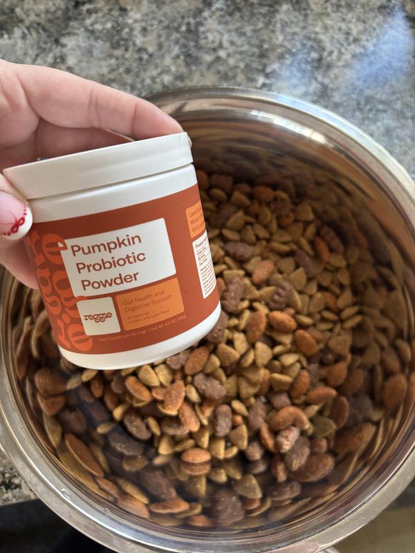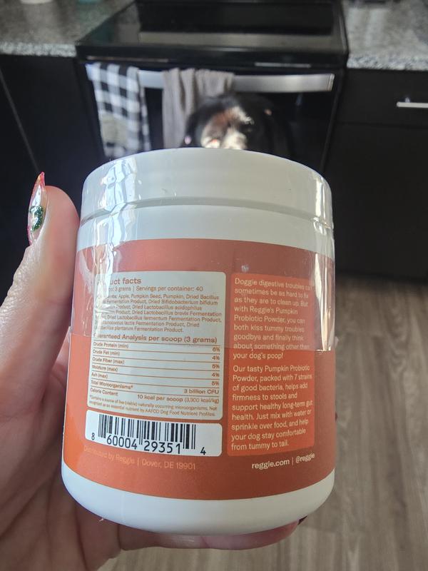 Ever since I brought my newf home from the breeder, probiotic powder has been a staple in her diet. The puppy food the breeder was feeding her didnt agree with her, so I immediately changed her food and added some probiotic powder. Out of all the ones we have tried, Reggies probiotic pumpkin powder has to be one of her absolute favorites! We havent had any tummy problems since starting this powder. Pumpkin is one of her favorite foods, and the minute you open the container you can smell the actual pumpkin! I soak her kibble with warm water, and when added to her dinner it makes a nice gravy. The only downside is i wish the container was just a little bigger for the price, but with how much my girl enjoys this product i will definitely be adding it to my rotation!