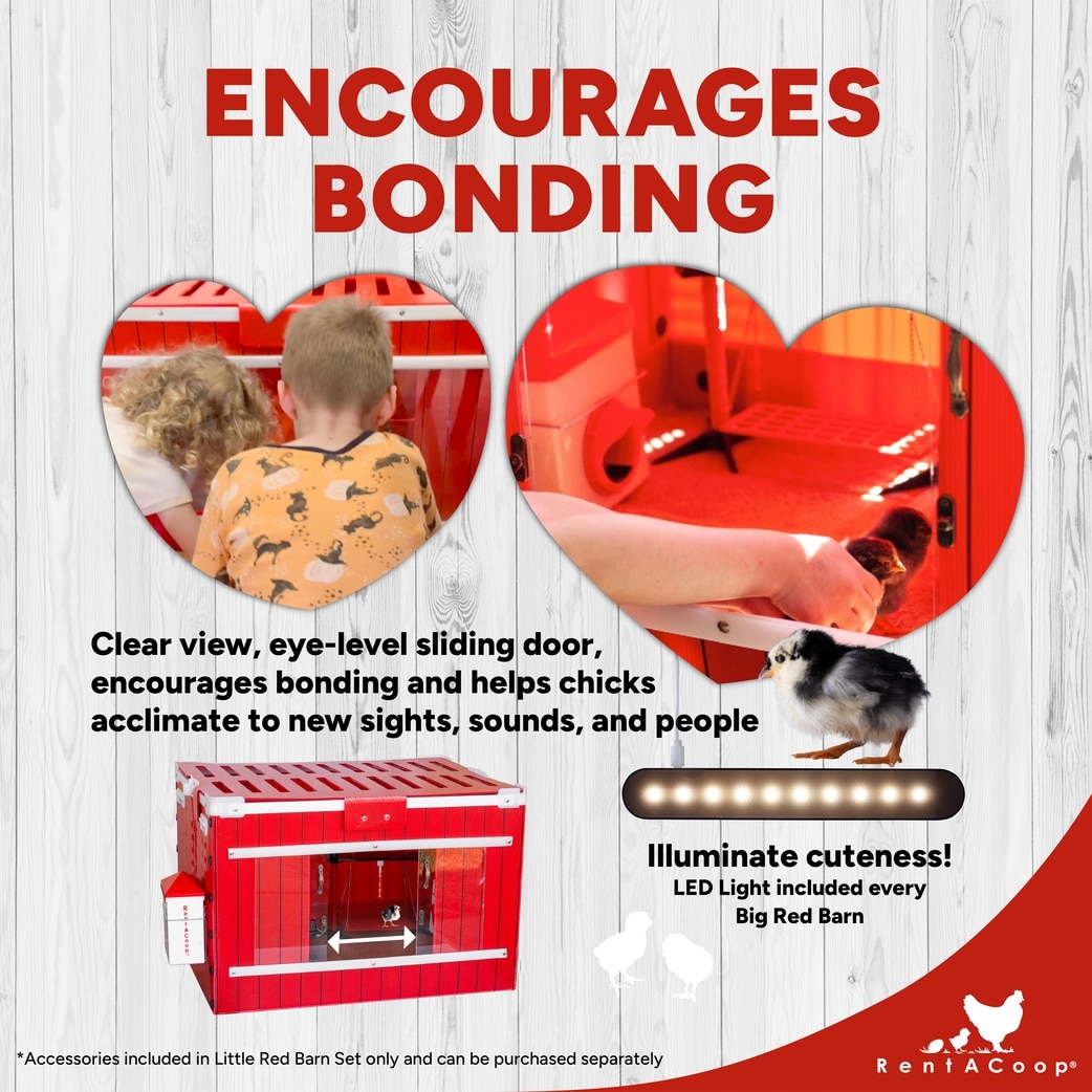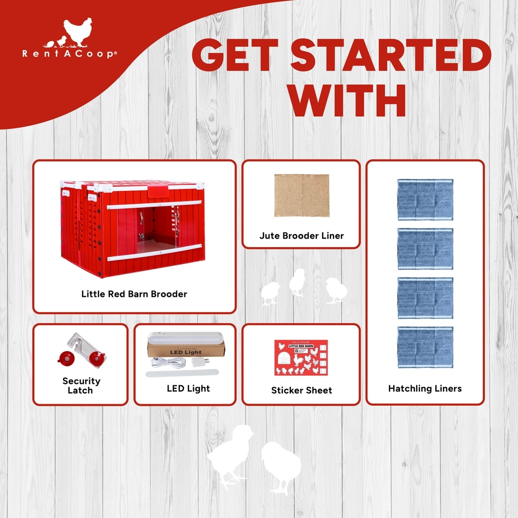 The large RentACoop Red Barn Chick Brooder will fit 10 or more chicks depending on the breed and size.