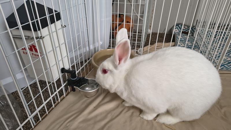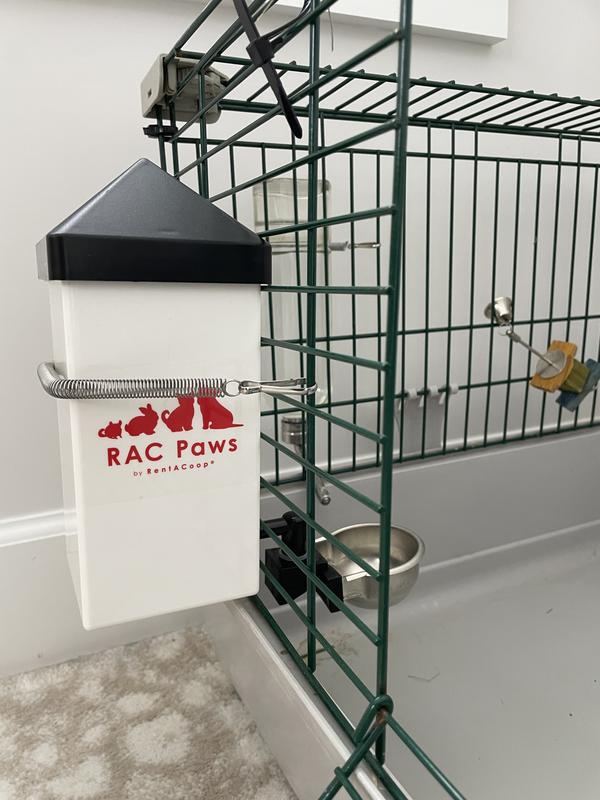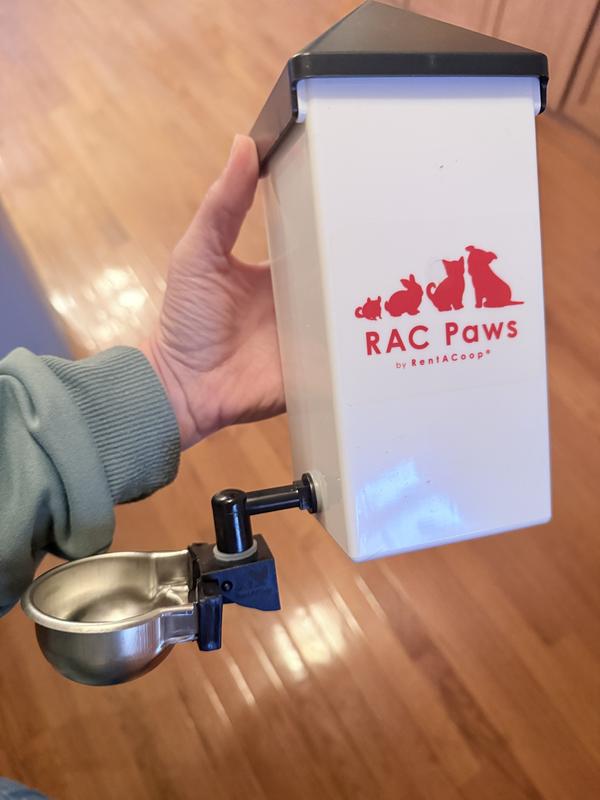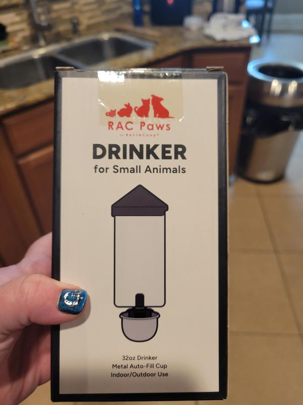 The RAC Paws by RentACoop Small Pet Metal Cup Drinker, 32oz is a great water supply system. My dwarf bunny has easy access to a clean water supply. It is easy to