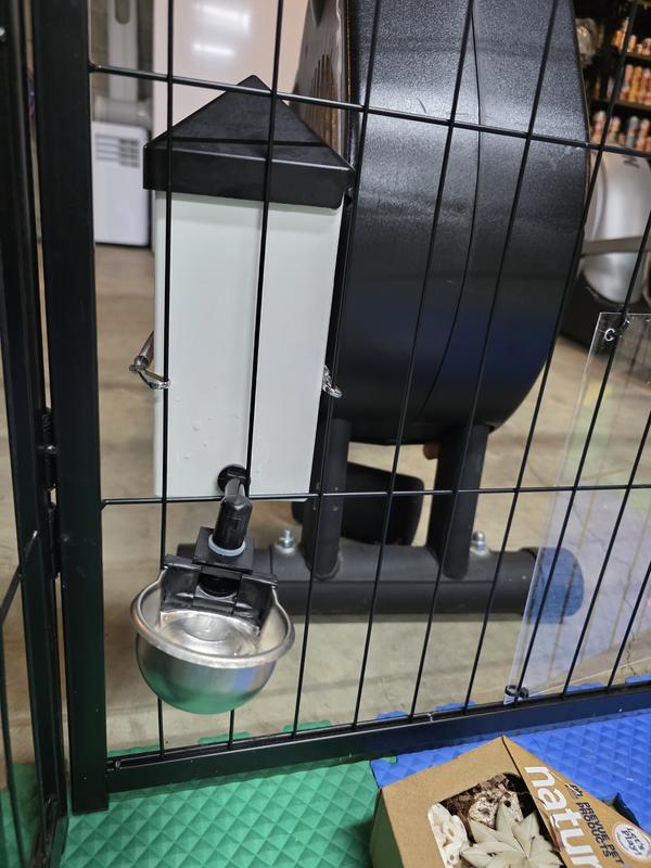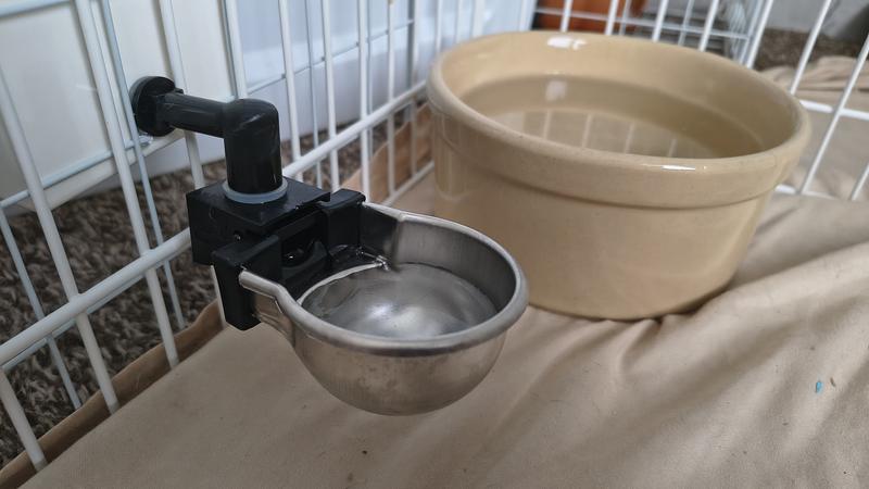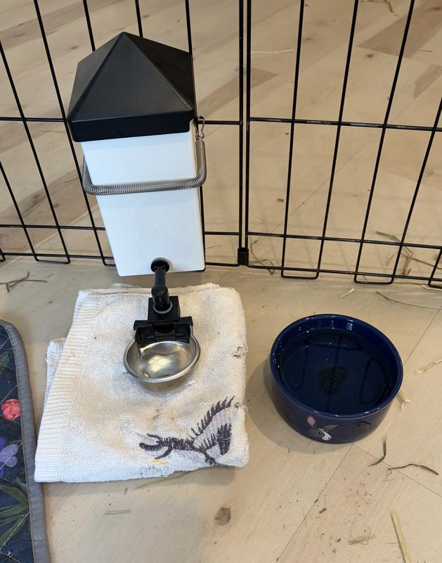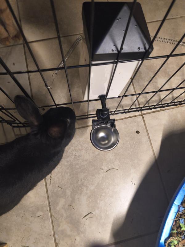 The RAC Paws by RentACoop Small Pet Metal Cup Drinker, 32oz is a great water supply system. My dwarf bunny has easy access to a clean water supply. It is easy to refill.