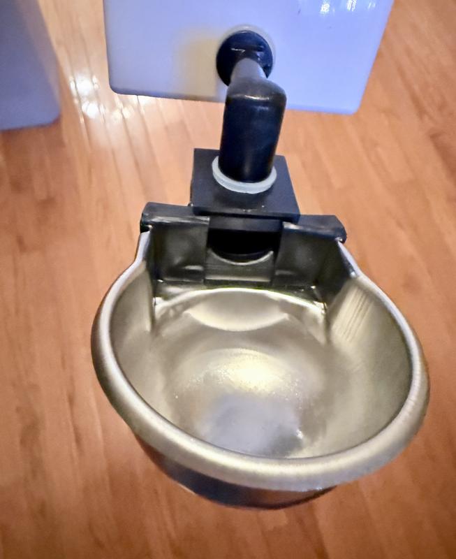- The metal cup automatically refills to 3/4ths full of fresh water.