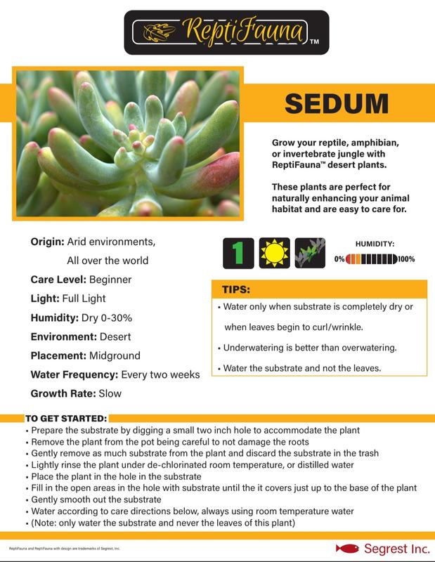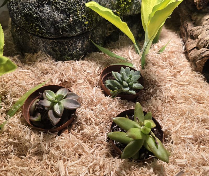 The ReptiFauna Assorted Sedum Desert Plant, 2-in Pot, 3 count arrived plump and healthy although they were strangely packed in plastic wrapping without labels or care instructions. Soil had spilled out of the pots in transit. I scooped the soil back in and everything was good as new. The assorted sedum desert plants (aka succulents) were as pictured. I placed the pretty little succulents into Nake the Snake’s enclosure. Nake is 4 year old ball python. He has aspen snake bedding as his substrate. I did not take the plants out of their pots but just sunk the pots into the bedding on the humid side of the tank that has the waterfall. They have not seemed to need any watering in the time I’ve had them. Nake routinely knocks them out of place, and I routinely set them back up. These ReptiFauna Assorted Sedum Desert Plants do enhance the look of the enclosure. I would imagine there are other reptiles that would appreciate them more than Nake. He cannot use them to hide or climb so they are just to spruce up the aesthetics.