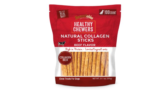 Rewardables Healthy Chewers Natural Collagen Sticks are made with real beef and rich in naturally occurring collagen, an essential amino acids to support healthy joints, skin, and coat. With limited ingredients, they’re easy to digest and full of flavor dogs love.