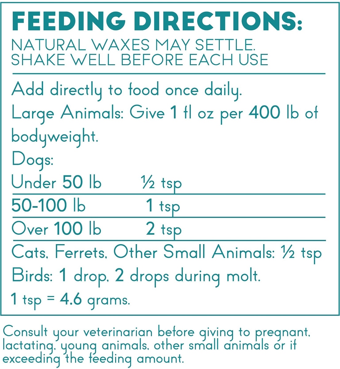 Large Animals: Give 1 fl. Oz. per 400 pounds of body weight. Cats, Ferrets, Small Animals: 1/2 tsp Birds: 1 drop (2 during molt)
