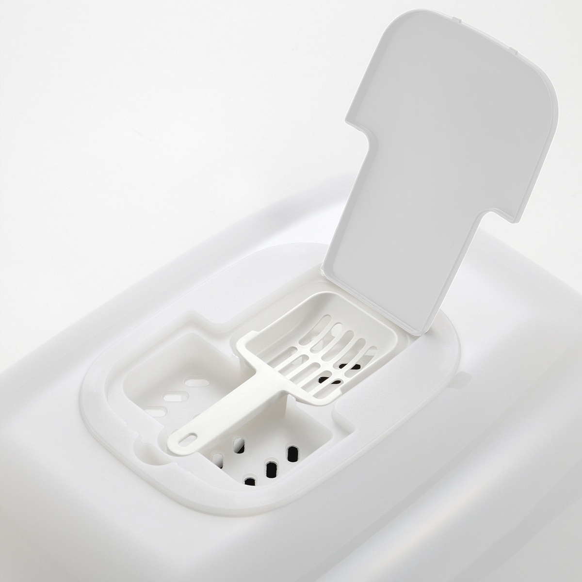 - Includes a scoop that can be stored in the recessed compartment on top of the hood.