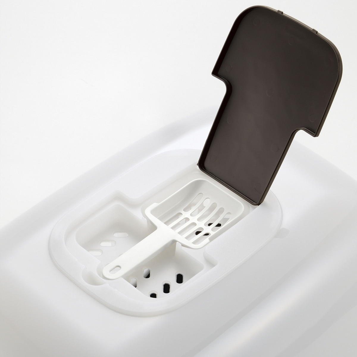 - Includes a scoop that can be stored in the recessed compartment on top of the hood.