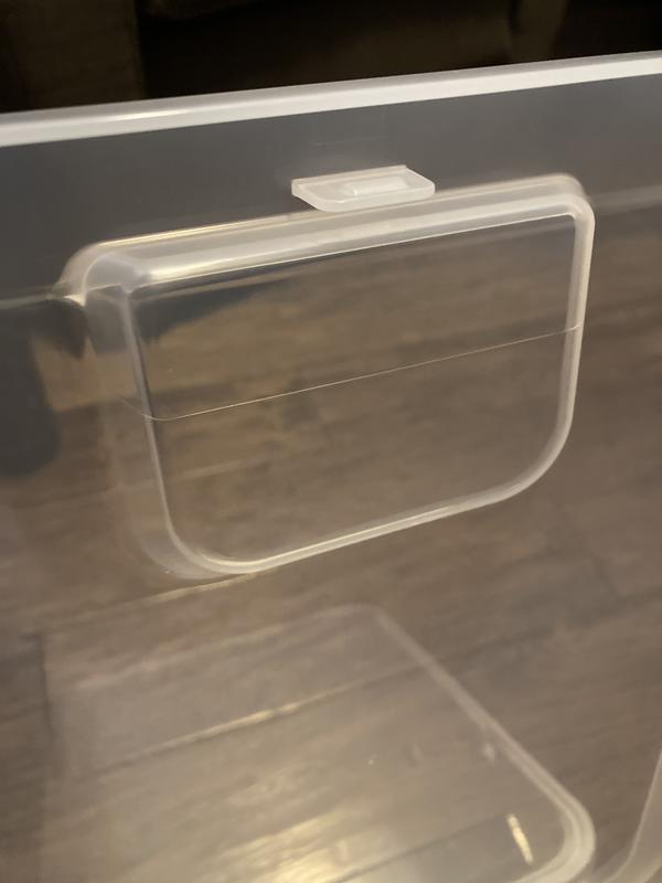 This container perfectly fit under the shelf in my cabinet. I recently moved to a new apartment and needed to store dog food in my kitchen cabinet. It is sleek,