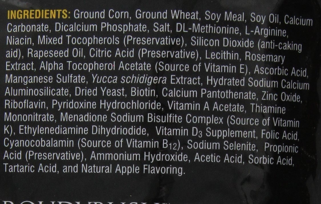 Ground Corn, Ground Wheat, Soybean Meal, Soybean Oil, Alfalfa, Calcium Carbonate, Dicalcium Phosphate, Salt, L-Lysine, DL-Methionine, L-Arginine, Niacin, Silicon Dioxide (Anti-Caking Aid), Citric Acid (Preservative), Mixed Tocopherols (Preservative), Vegetable Oil, Rosemary Extract, Alpha Tocopherol Acetate (Source Of Vitamin E), Ascorbic Acid, Manganese Sulfate, Yucca Schidigera Extract, Dried Yeast, Biotin, Calcium Pantothenate, Zinc Oxide, Riboflavin, Pyridoxine Hydrochloride, Vitamin A Acetate, Thiamine Mononitrate, Potassium Iodide, Vitamin D3 Supplement, Folic Acid, Vitamin B12 Supplement, Sodium Selenite, Propionic Acid (Preservative), Ammonium Hydroxide, Acetic Acid, Sorbic Acid (Preservative), Tartaric Acid, And Natural Apple Flavoring